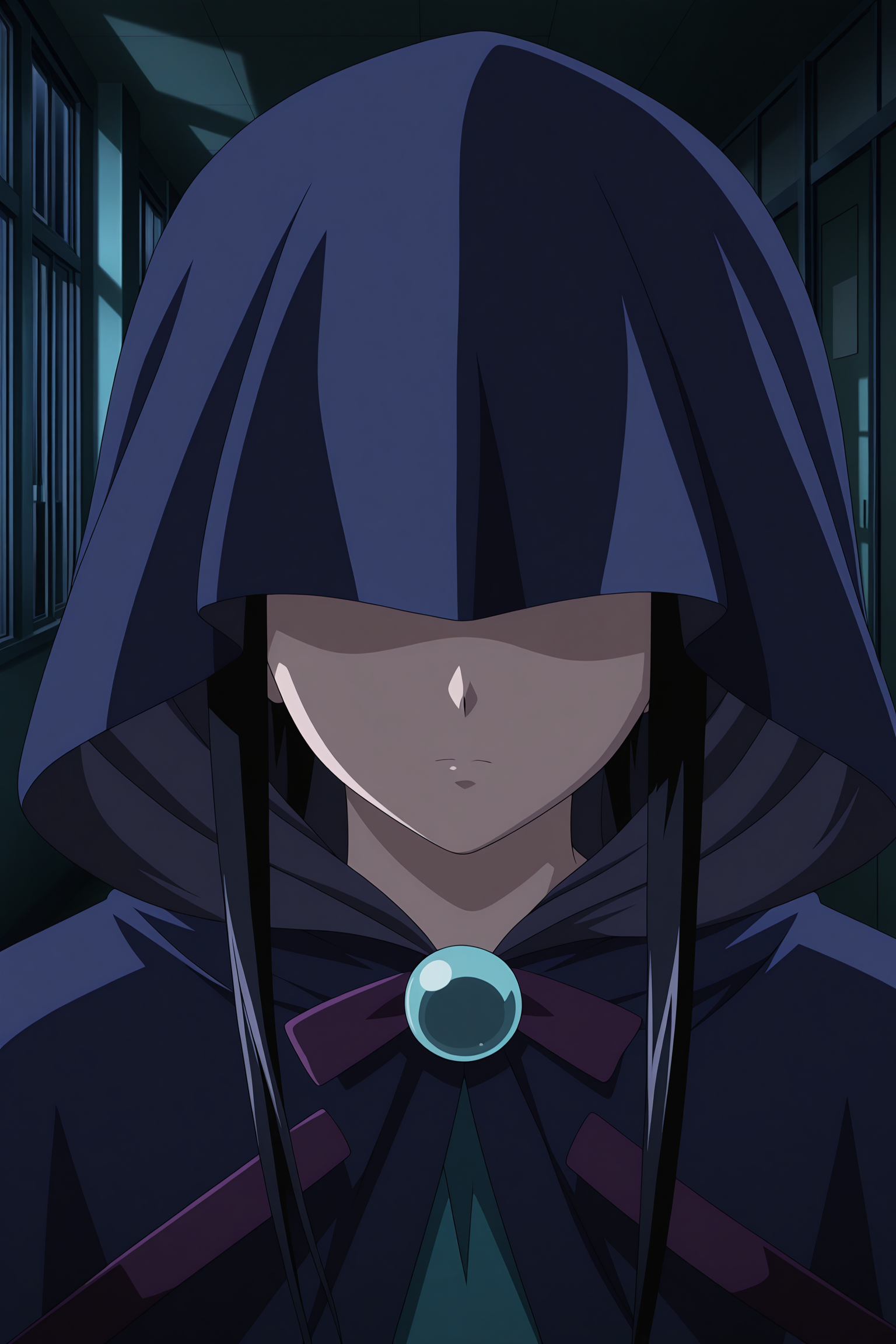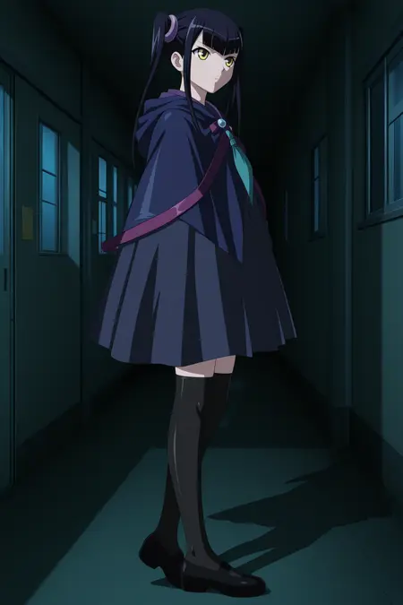 saji genpou, 长发, 黑发, 双马尾, 发饰, 侧发, V型刘海, 黄眼睛, 手镯, 蓝色斗篷, 兜帽放下, 短袖, 灰色衬衫, 白色水手领, 水蓝色围巾, 衬衫不塞进裙子里, 黑色裙子, 百褶裙, 黑色过膝袜, 黑色鞋子, Mary Jane鞋