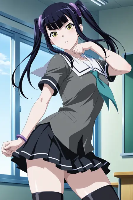 saji genpou, 长发, 黑发, 双马尾, 发饰, 侧发, V型刘海, 黄眼睛, 手镯, 短袖, 灰色衬衫, 白色水手领, 水蓝色围巾, 衬衫不塞进裙子里, 黑色裙子, 百褶裙, 黑色过膝袜, 黑色鞋子, Mary Jane鞋