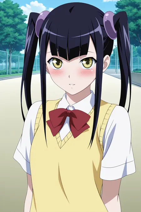 saji genpou, 长发, 黑发, 双马尾, 发饰, 侧发, V型刘海, 黄眼睛, 手镯, 短袖, 白色衬衫, 有领衬衫, 黄色背心, 红色领结, 绿色裙子, 格子裙, 百褶裙, 黑色过膝袜, 黑色鞋子, Mary Jane鞋