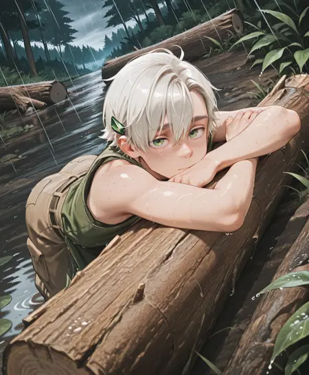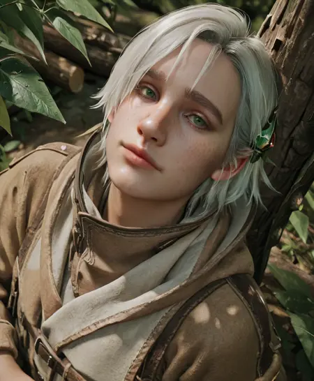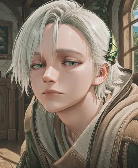 triggers are: 1boy,Erik,white hair,green eyes,freckles,hair ornament,