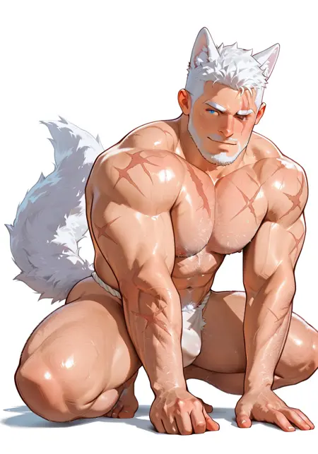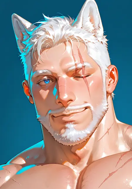 트리거 단어 = OkamiBoy프롬프트흰색 늑대 귀, 짧은 흰색 머리카락, 흰색 안면 수염, 파란 눈, 흰색 머리카락, (왼쪽 눈을 감고 왼쪽 눈 위에 흉터, 왼쪽 눈 위에 보이는 얼굴 흉터), 흰색 늑대 꼬리, 흰색 음부 털, 흰색 신체 털
