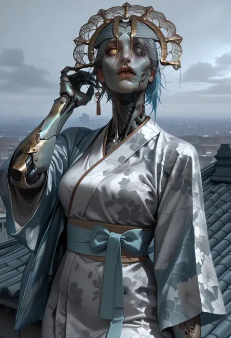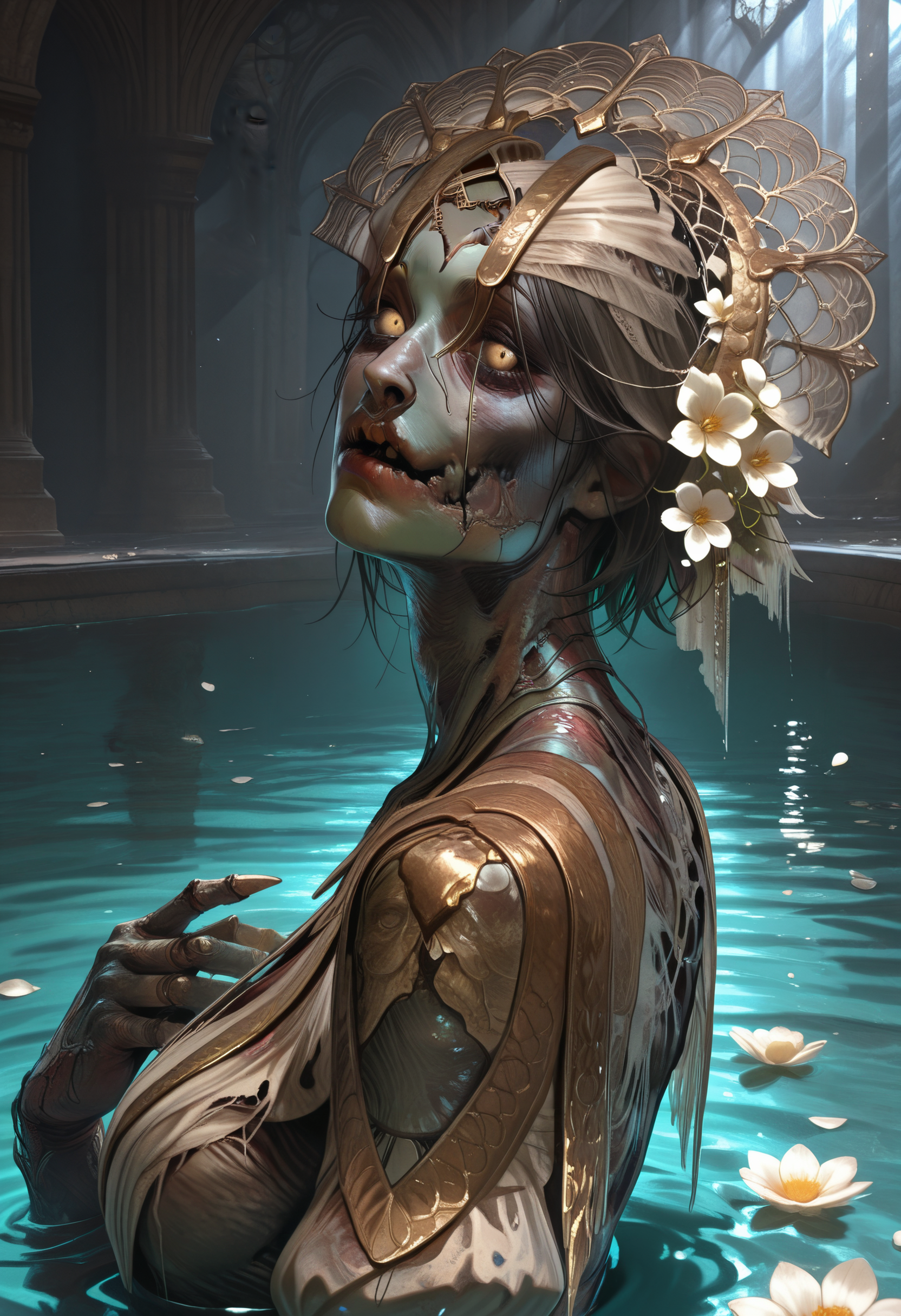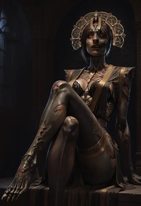 DBDTh3Pl4g3, 1girl, monster girl, one eyes covered, headpiece, short hair, undead