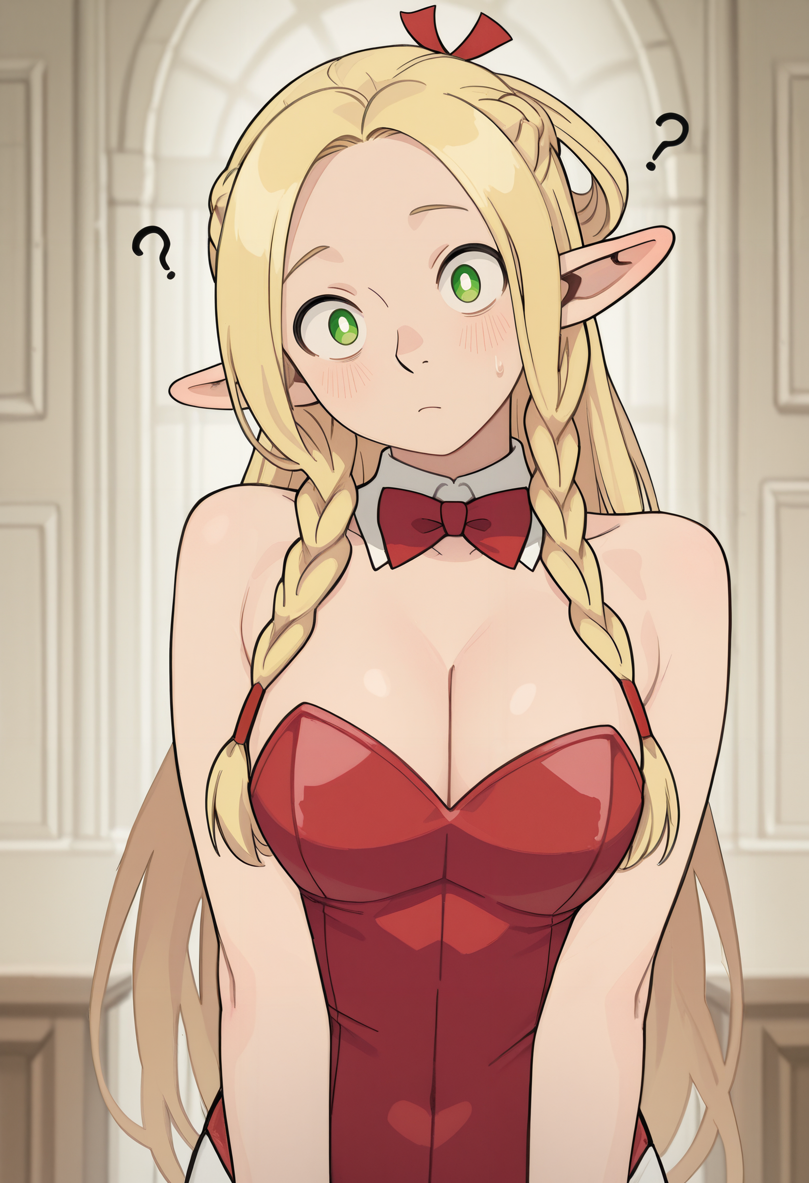 DIDMarcille, 1girl, long hair, blonde hair, multiple braids, half up, green eyes, pointy ears