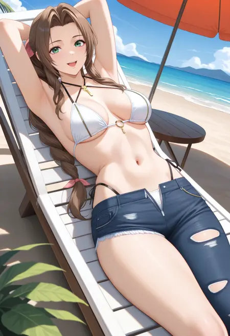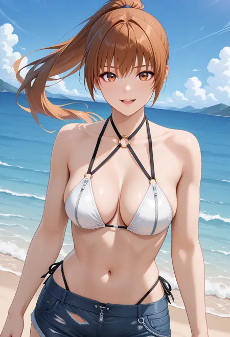 Basic prompt: "SkinnyShark_doaxvv,white bikini,bikini top only,zipper bikini,o-ring,halterneck,zipper,single pantsleg,torn jeans,highleg panties,underwear,sandals"