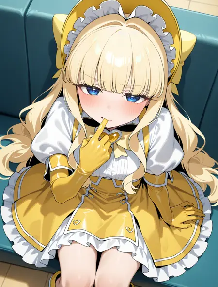 Tenkawa Kaoruko, 금발, 긴 머리, 머리 리본, 지팡이 들고, 파란 눈, 드레스, 마법소녀, 풍성한 소매, 노란 장갑, 팔꿈치 장갑, 하트, 허벅지 긴 양말, 명작, 최고 품질, 최신, absurdres, highres, very awa