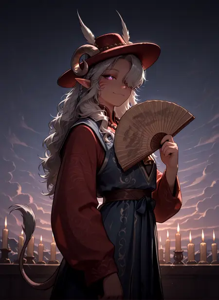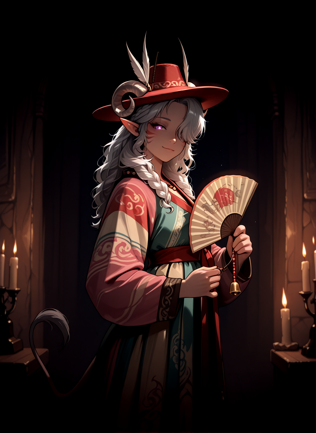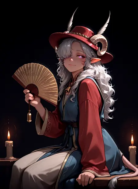 来自遥远东方异域、早已被遗忘的信仰中女祭司所穿戴的服饰。血红与深渊蓝的织物交织缠绕,一缕红色绳结摇摇欲坠,仿佛束缚着生死的界限。羽冠回应着天界的召唤,而铃铛项链则响起,以招引或驱逐迷失的灵魂。
