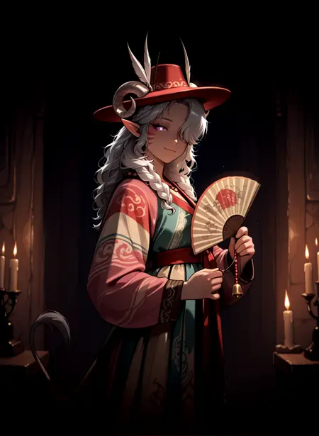 Garments worn by the shamanesses of a distant Eastern foreign land, from a forgotten faith. Blood-red and abyssal blue fabrics intertwine, and a red knot precariously drapes, seemingly binding the very boundary of life and death. A feathered hat answers the call of the heavens, while a bell necklace sounds to lure or ward off lost souls.