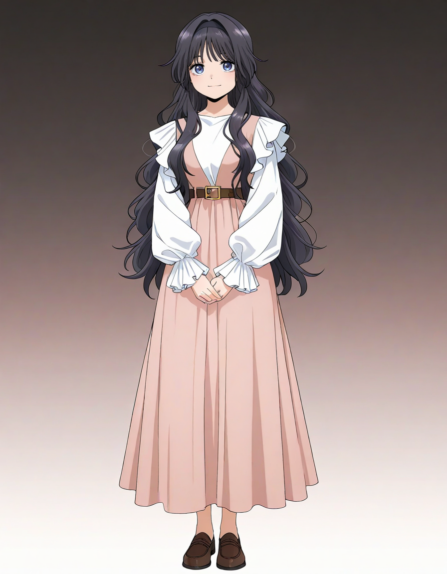 white blouse, pink pinafore dress, frills, long sleeves, frilled sleeves, brown belt, gold belt buckle, brown loafers