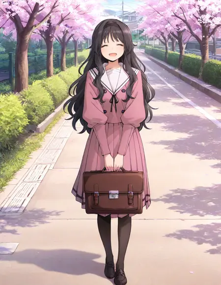 school uniform, pink serafuku, white sailor collar, black ribbon, black buttons, long sleeves, puffy sleeves, pleated skirt, black pantyhose, black loafers