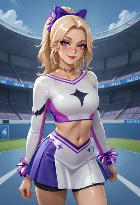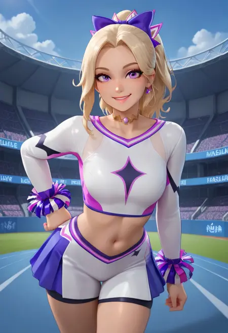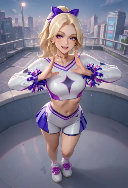 HayleeSkye, 귀여운 얼굴, 두더지점, 하얀 피부, 메이크업, 머리 리본, 머리 장식, 금발, 토끼 꼬리, 긴 머리, 보라색 눈, 붉은 입술, 뺨붉음, 크롭탑, 치어리더 유니폼, 긴 소매, 허리, 배꼽, 흰색 미니스커트, 스커트 밑 보라색 바지, 흰색 양말, 흰색 스니커즈
