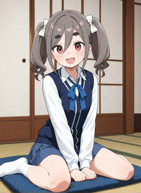 school uniform, twintails, dress shirt, collared shirt, white shirt, long sleeves,neck ribbon, blue ribbon, hair bow, white bow, blue vest,pleated skirt, blue skirt,white socks,loafers