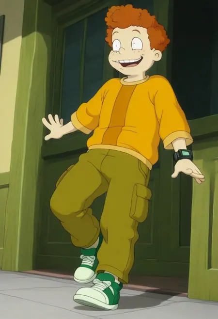 2시즌: 해롤드 프럼킨, 혼자, 1소년, 진한 주황색 곱슬머리, 두더지자국, 손목시계, 노랑과 갈색 셔츠, 초록 바지, 초록 신발