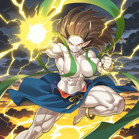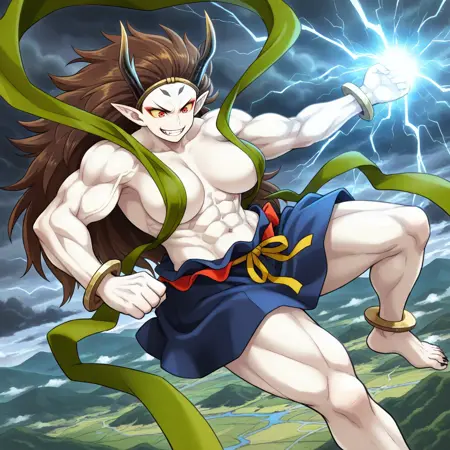 | 训练词汇 | hikimayu, colored skin, white skin, brown hair, long hair, obliques, abs, horns, yellow sclera, red eyes, pointy ears, green hagoromo, large breasts, topless, bracelet, anklet, gold circlet, red eyeshadow, v-shaped eyebrows, tsurime, grin, fangs已复制! |