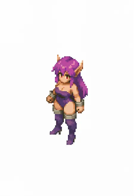 기본 외모: 긴 머리, 보라색 머리, 눈 사이의 머리, 붉은 눈, 날카로운 귀, 보라색 목걸이, 보라색 레오타드, 가슴 노출, 어깨 없음 레오타드, 팔꿈치 장갑, 보라색 장갑, 손가락 없음 장갑, 팔찌, 허벅지 부츠, 보라색 신발, 하이힐 부츠