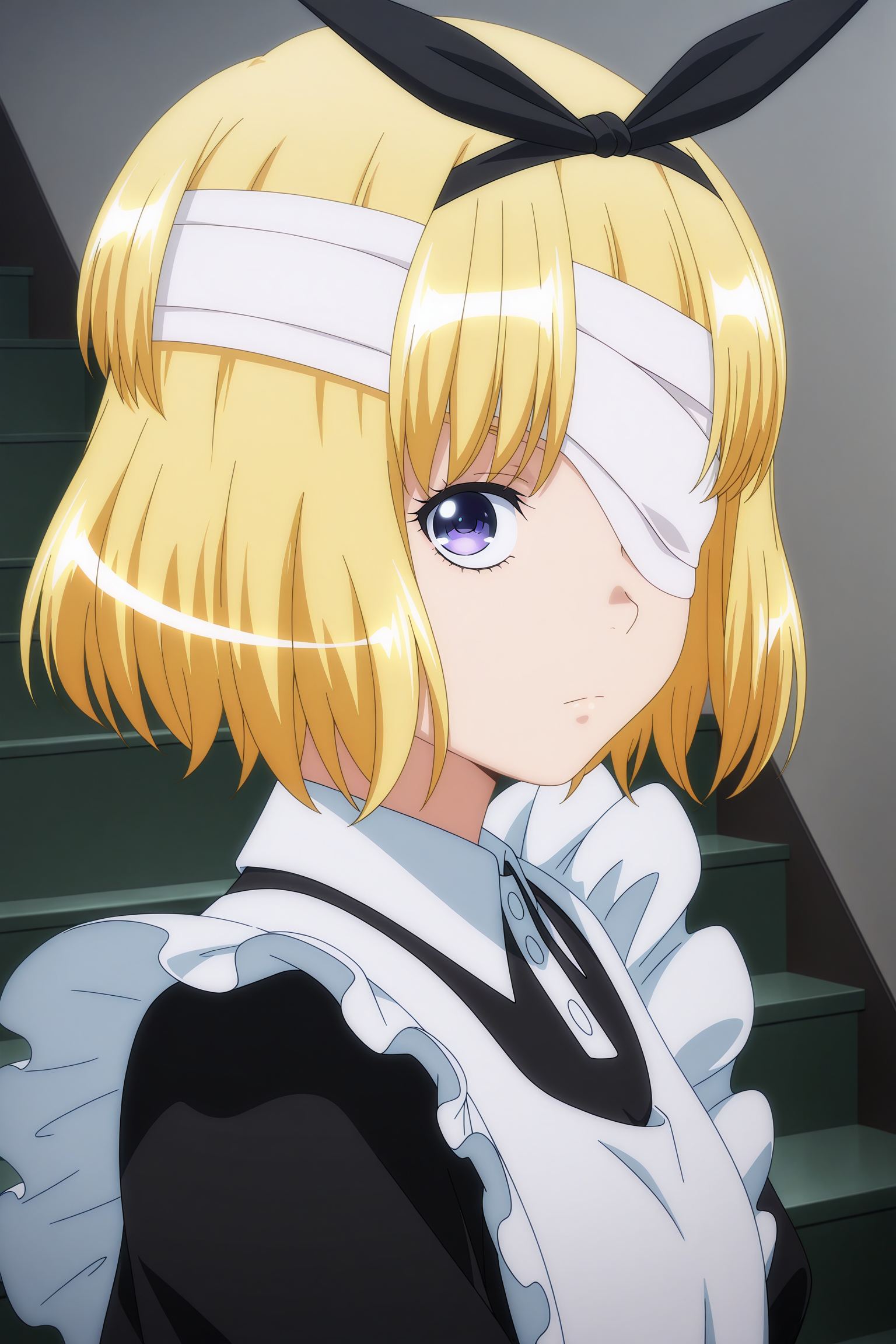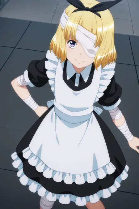 indara, short hair, blonde hair, bandage over one eye, bow hairband, purple eyes, puffy short sleeves, maid, black dress, maid apron, medium dress, lace-trimmed dress, bandaged arm, bandaged wrist, bandaged knees, bandaged leg, bandaged foot, black footwear, mary janes