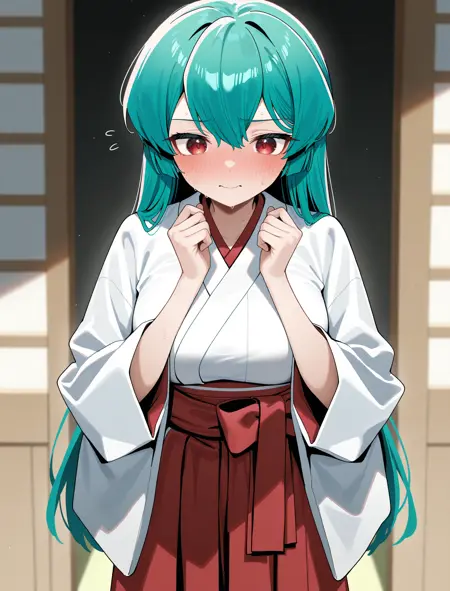 Minakami Sayo, green hair, long hair, red eyes, white kimono, red hakama, long sleeves, wide sleeves, best quality,newest,absurdres,highres,very awa