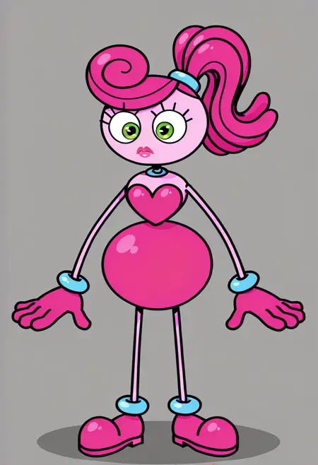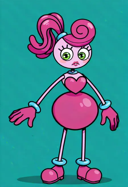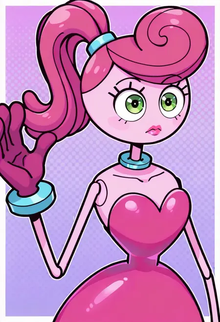 | 训练词汇 | MommyLongLegsGT, 1girl, stylized, cartoonish, pink body, exaggerated long limbs, round torso, bright green eyes, spiraled pink ponytail, blue hairband, heart-shaped chest, magenta sleeveless dress, magenta gloves, blue cuffs, magenta shoes, playful design, magenta eyelids, pink lips, lipstick, light blue choker已复制! |