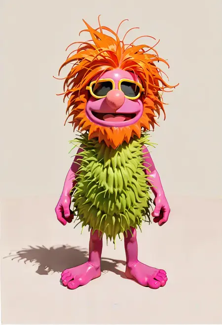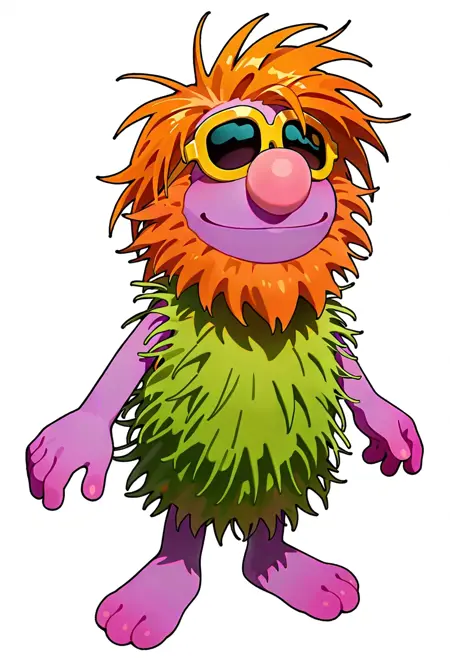 ManhaManhaTM, 1boy, messy orange hair, bushy orange beard, yellow sunglasses, pink-purple skin, green shaggy outfit resembling moss or fur, pink nose