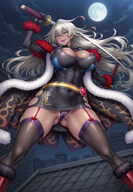 Tags: shinganji ryuu, long hair, grey hair, tsurime eyes, green eyes, purple lips, lipstick, sexy, curvy, huge breasts