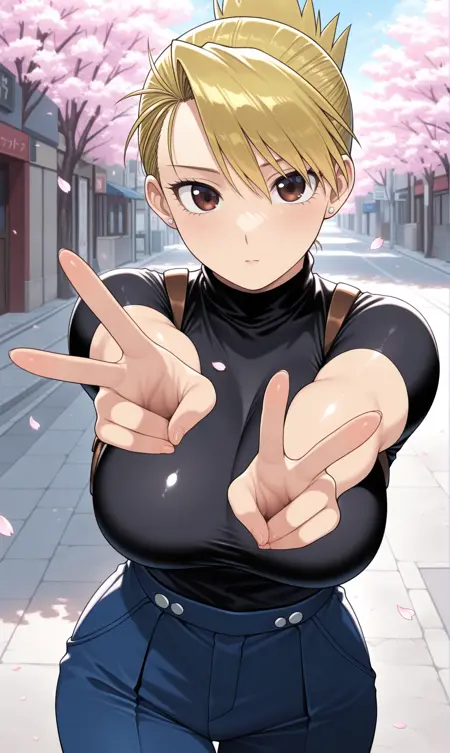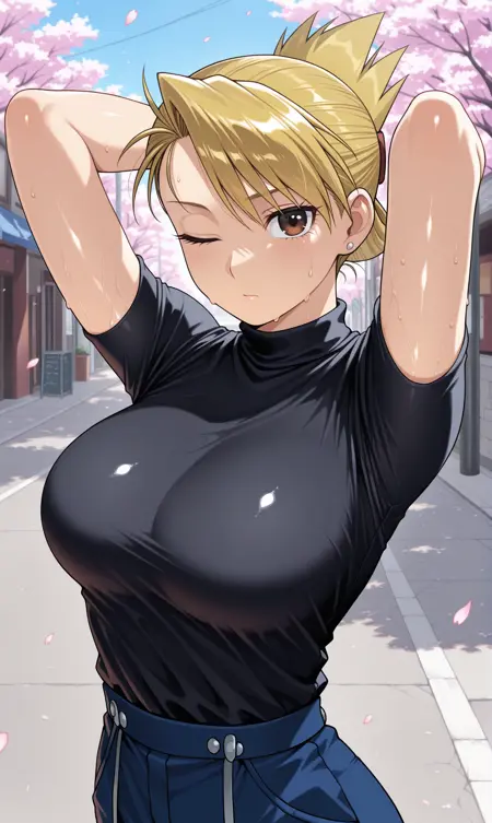 riza hawkeye, stud earrings, jewelry, blonde hair, brown eyes, swept bangs, updo