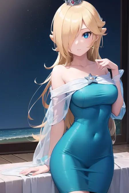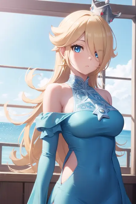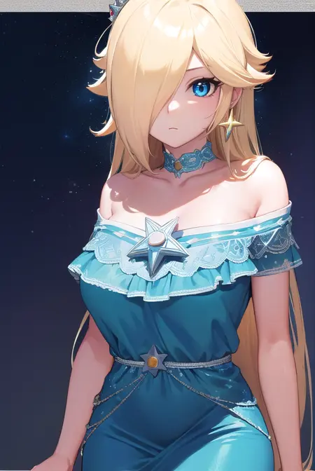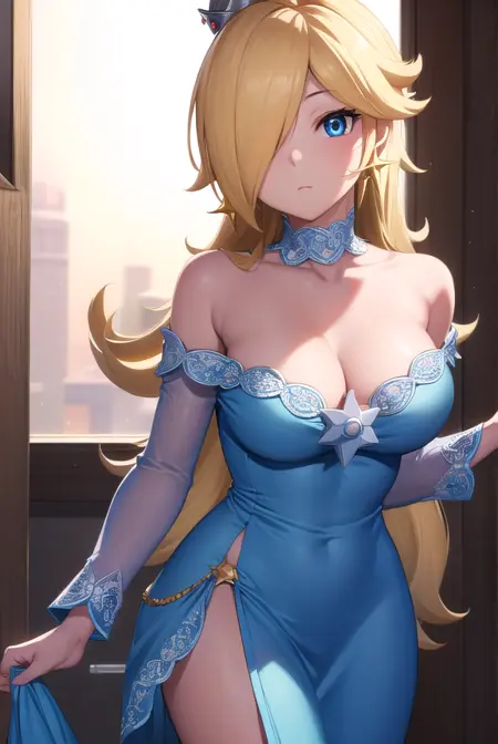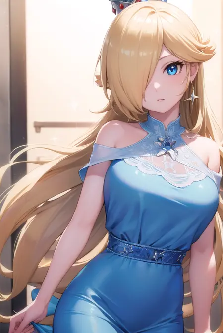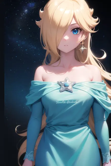 rosalina, blonde hair, blue eyes, hair over one eye, long hair,