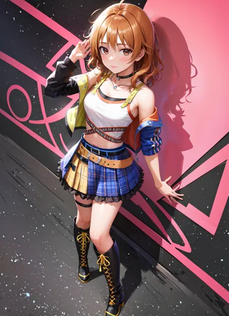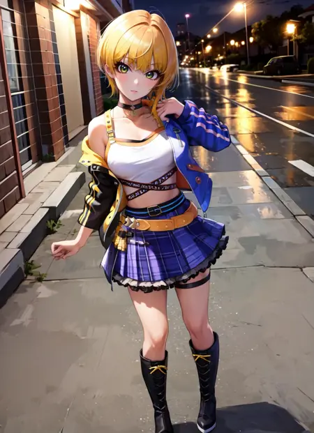 , funkydancing outfit, black choker, collarbone, necklace, cropped jacket, open jacket, long sleeves, bare shoulders, crop top, midriff, miniskirt, frilled skirt, belt, thigh strap, knee boots