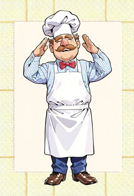 Swe3dishChefTM, 1boy, white apron, blue-and-white striped shirt, red bow tie, plaid blue pants, brown shoes, thick brown eyebrows covering eyes, closed eyes, pink nose, brown mustache, brown hair,