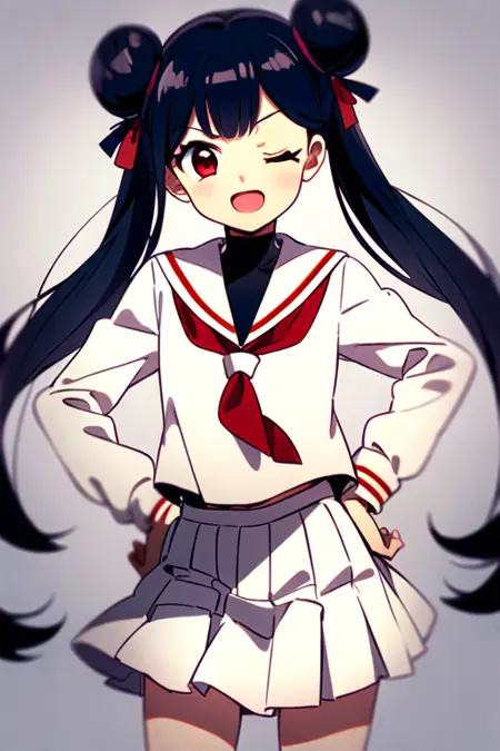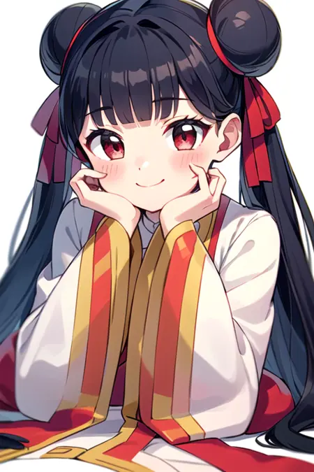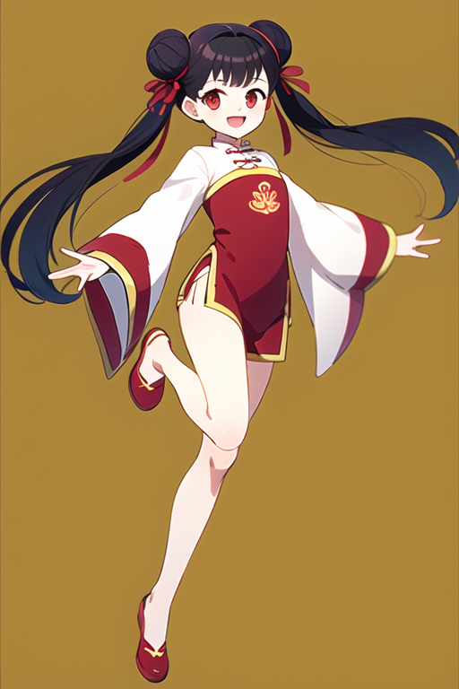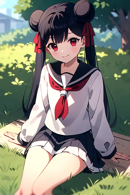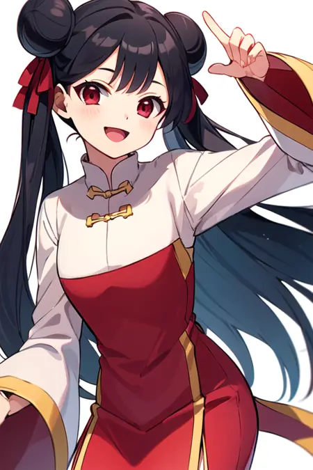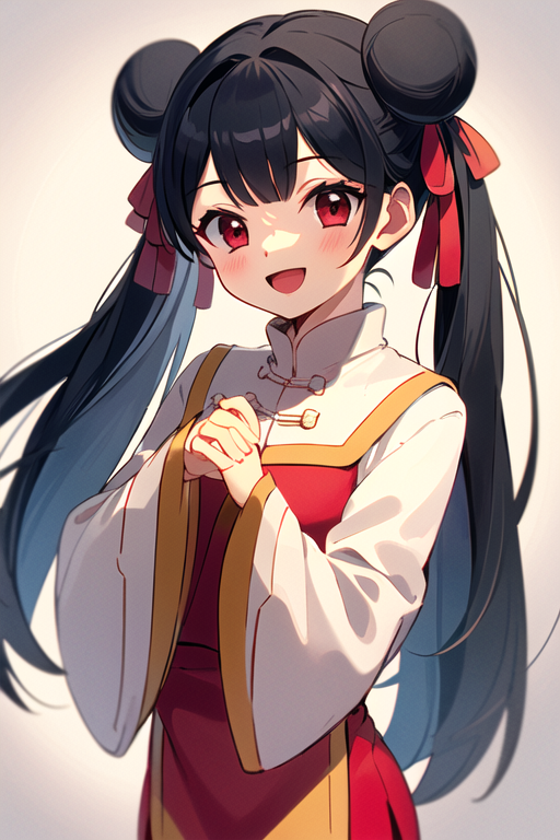 meiling_scc, red eyes, dark blue hair, twin bun, twin tails