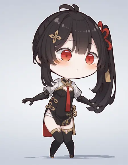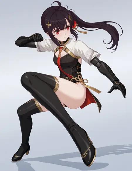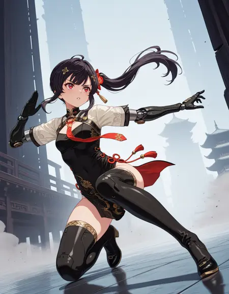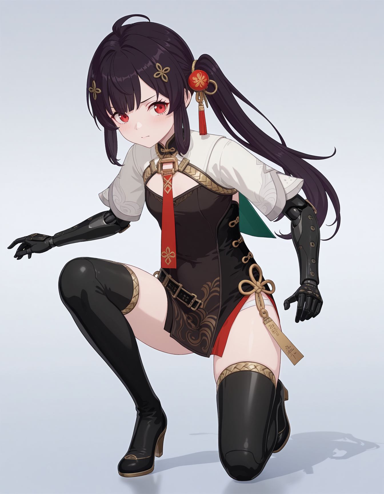 mai_pgr_pl_hz,black_hair,side_ponytail,red_eyes,hair_ornament,red_necktie,chinese_clothes,black_dress,short_sleeves,mechanical_arms,black_footwear,thigh_boots