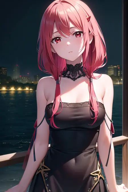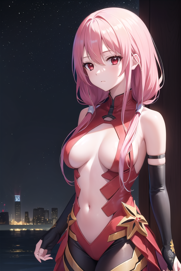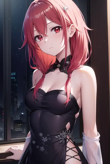 裸露肩膀,黑色过膝袜,中间开口,乳沟,分离袖子,肘部手套,露指手套,手套,肚脐,过膝袜,连衣裙,红色连衣裙,