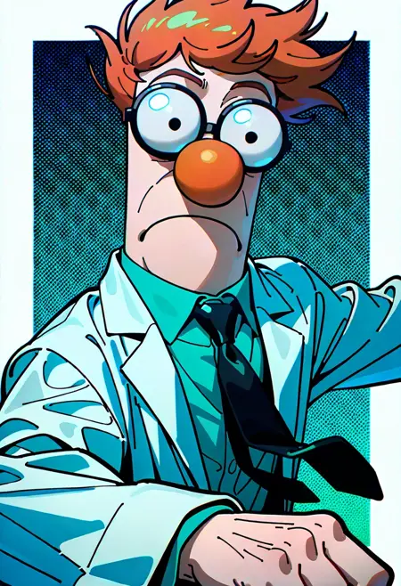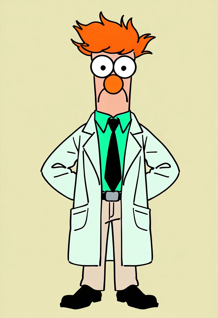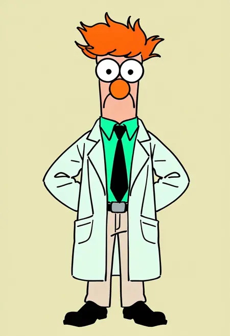 BeakerTM, 1boy, light green lab coat, green shirt, black neck tie, beige pants, wild orange hair, bulging black eyes, round orange nose, black shoes,