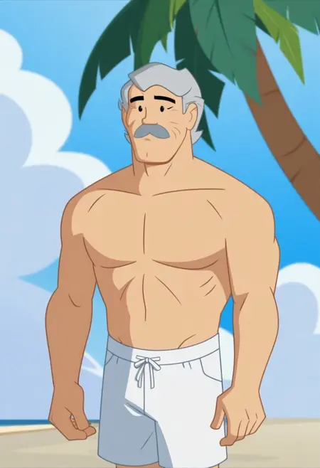 1man,solo,male focus,Charlie Burns,old man,mature,muscular,bara,short hair,gray hair,black eyes,mustache,thick eyebrows,police uniform,blue shirt,short sleeve shirt,black pants,black belt,black shoes