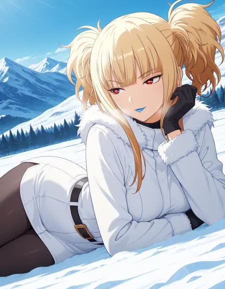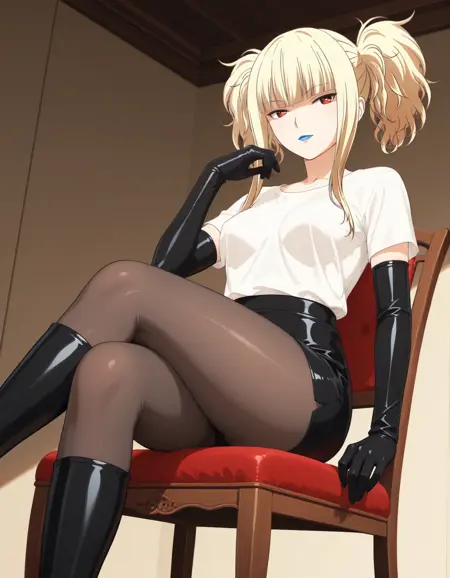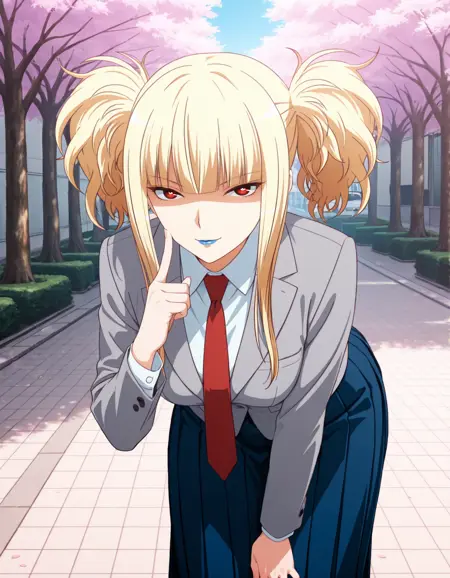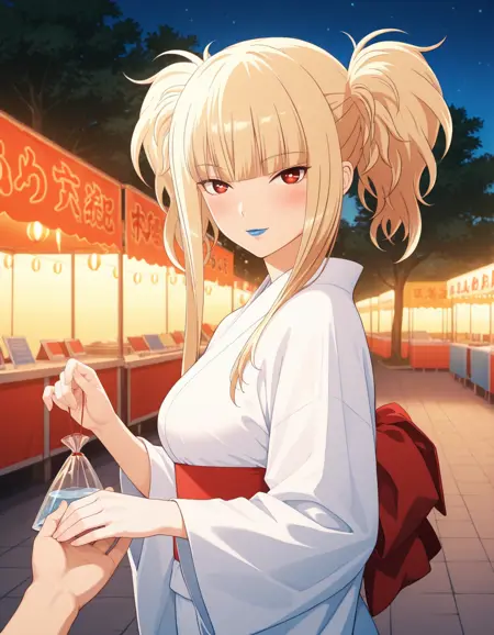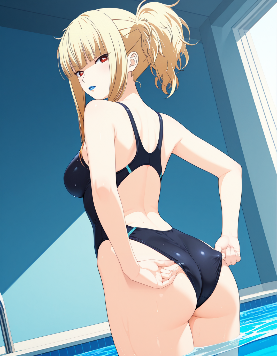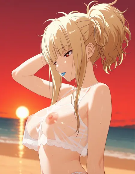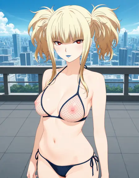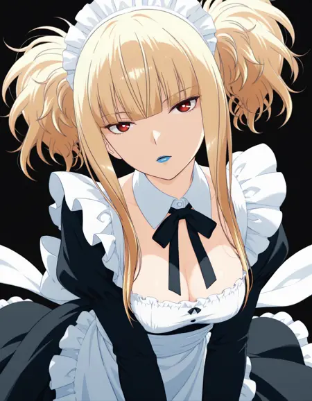V1:成熟した40歳の女性、ミルフ、金髪、ツインテール、前髪、濃い赤い目、青い唇、細い唇、中程度の自然な胸