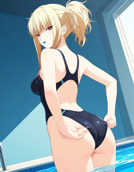 V1: mature, 40 y. o. woman, milf, blonde hair, twintails, bang, dark red eyes, blue lips, thin lips,medium natural breasts