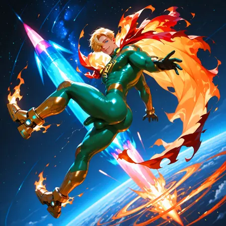 | トレーニングワード | domino mask, superhero bodysuit, robotic power armor, silver bodysuit gold trim, clothing cutouts, chest cutout, thigh cutout, revealing bodysuit, skimpy bodysuit,コピーしました! Detailed background, outer space, floating, suspended, stars,コピーしました! |