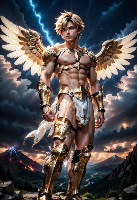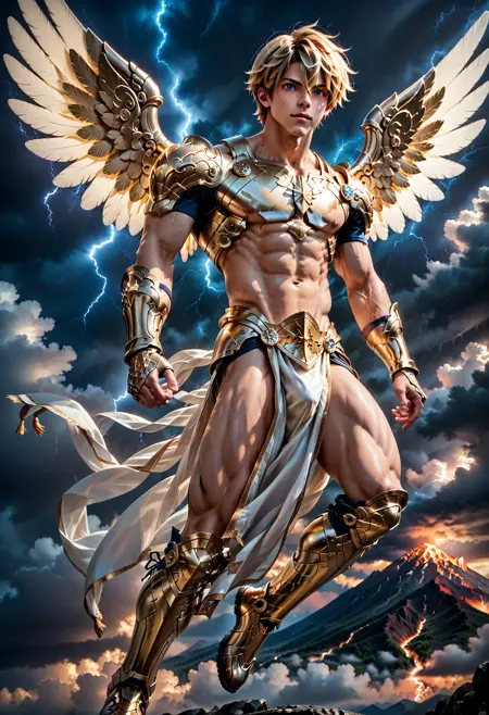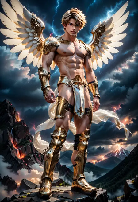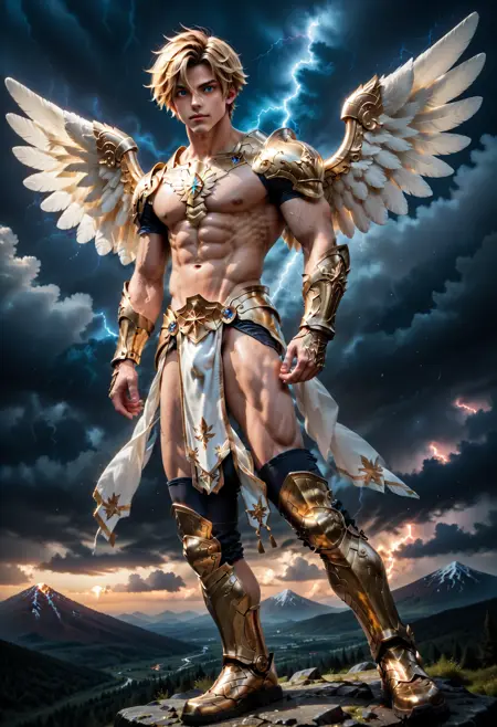 golden armor, armored boots, shoulder armor, neck armor, wrist armor, elbow armor, armored gloves, waist armor, crotch cloth, knee armor, calf armor, wings,