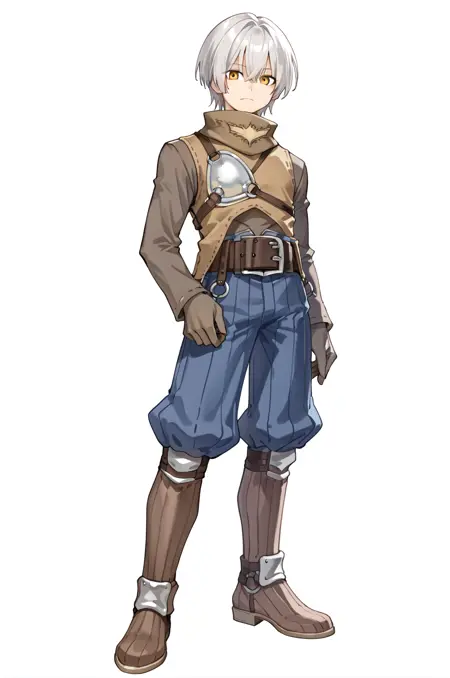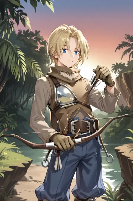prompt: archerROMale, brown gloves, blue pants, breastplate, long sleeves, brown shirt, puffy pants, vest, turtleneck, o-ring, belt, brown knee boots