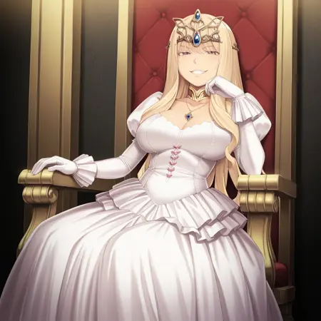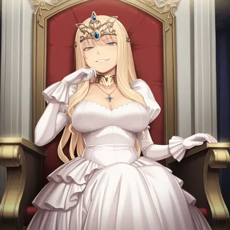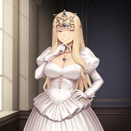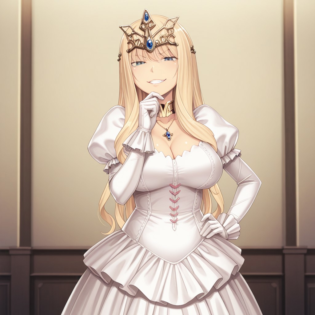 드레스: 1girl, 긴 머리, 금발, 회색 눈, 큰 가슴, 관모, 파란 보석, 황금 목걸이, 네크리스, 흰 드레스, 공주 드레스, 드레스 끈, 긴 드레스, 주름 드레스, 어깨 퍼프, 긴 소매,