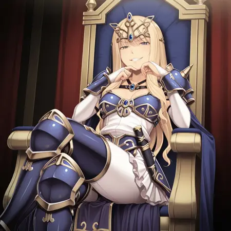 갑옷: 1girl, 긴 머리, 금발, 회색 눈, 가슴, 관모, 파란 보석, 가죽 끈, 파란 갑옷, 어깨 갑옷, 어깨 뿔, 가슴판, 팔뚝 보호대, 갑옷 부츠, 무릎 보호대, 힙 갑옷, 골반 커튼, 흰 셔츠, 분리된 소매, 흰 소매, 손가락 고리 장갑, 흰 치마, 주름 치마, 흰 팬티, 파란 허리 망토,