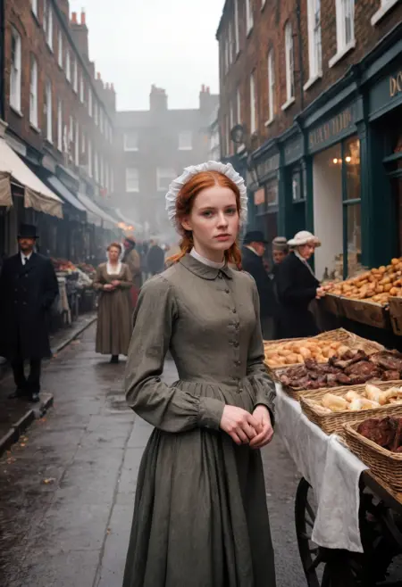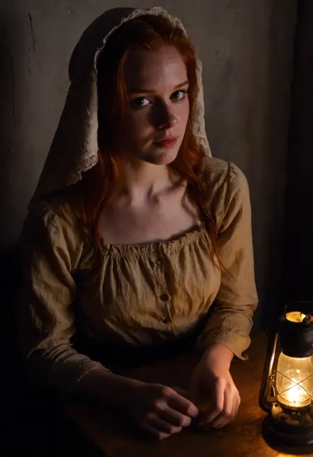 Jessica Domraine is a striking redhead with eyes that carry the weight of centuries and lips that rarely tell the whole truth. Born into obscurity, she slips through time like silk—sometimes a streetwise Victorian vendor with soot-streaked resolve, other times a high-fashion siren bathed in 60s spotlight. Her ginger hair, whether hidden under a bonnet or teased into a neon halo, is her signature—a blaze of rebellion in a world that insists on grey.