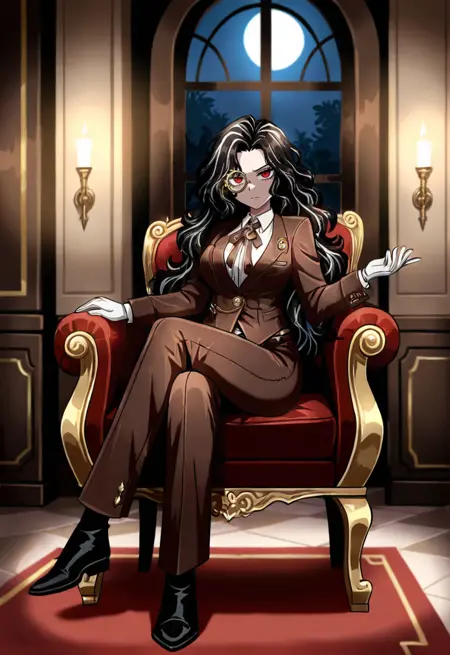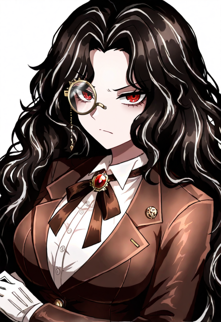 red eyes, golden monocle, black hair, long hair, wavy hair