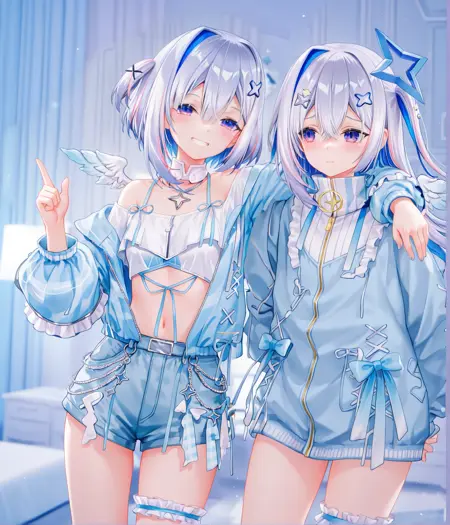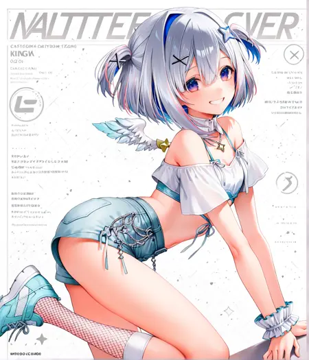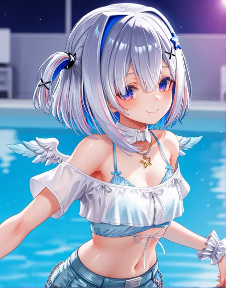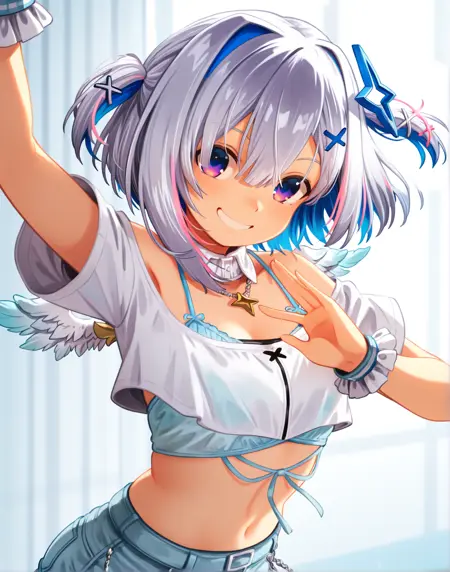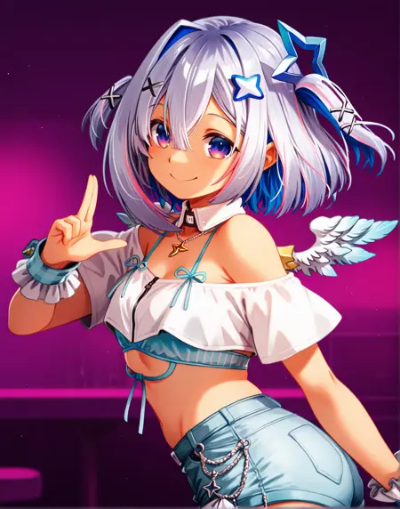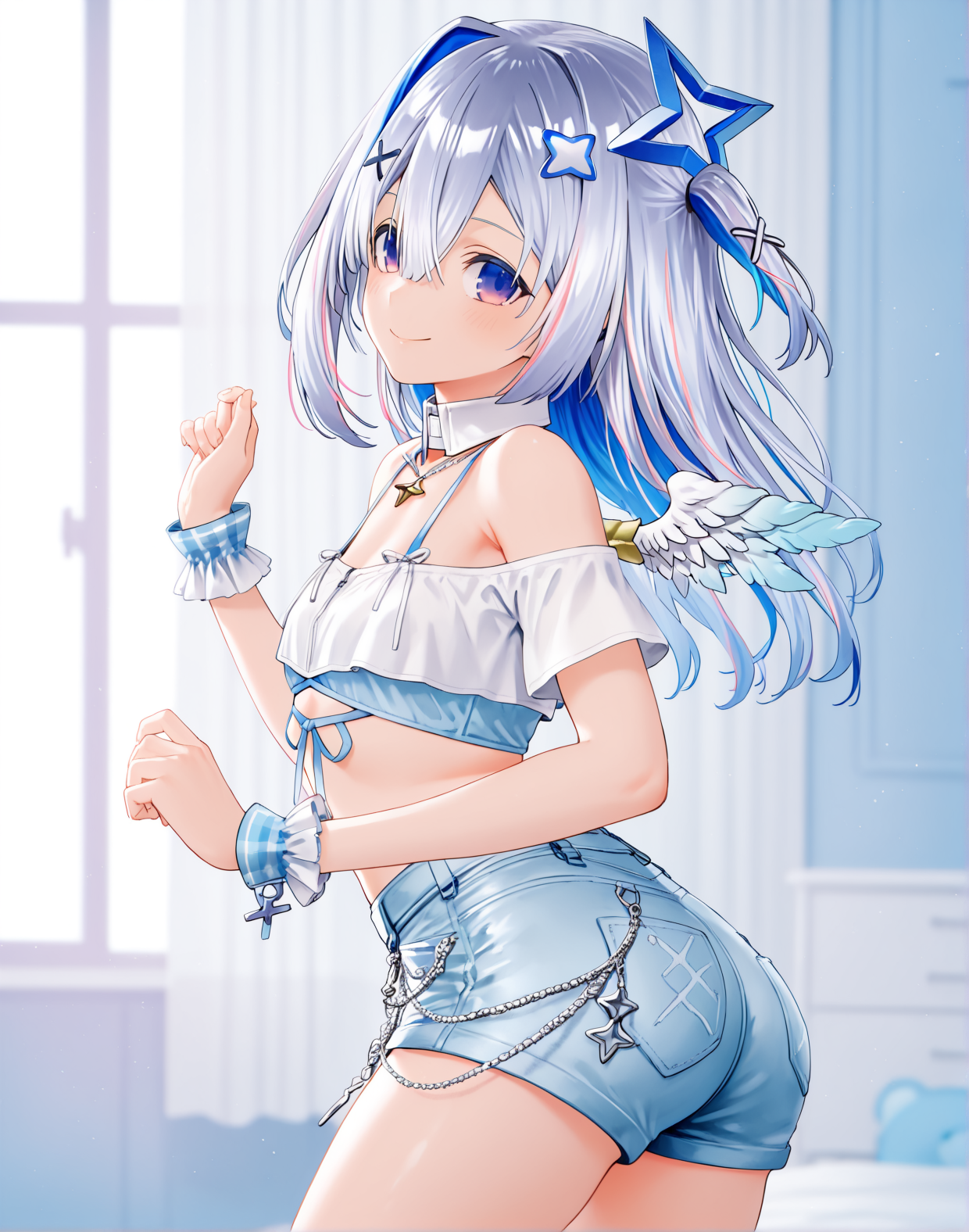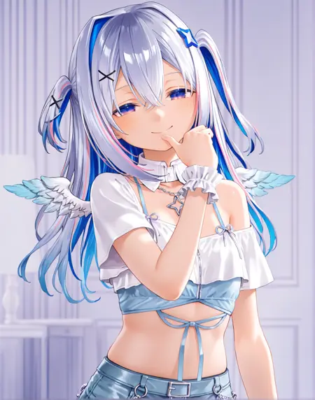 衣装タグ:ハロなし、髪飾り、白シャツ、短袖、お腹見せ、片肩出し、クロップトップ、短パン、(フィッシュネットソックス、膝丈ソックス、青い靴:1)、取り外し可能なカラー、白いカラー、片側上げ、チェーン、×髪飾り、淡い青い短パン、星のフリル付き cuffs、ミニ翼、青いブラ