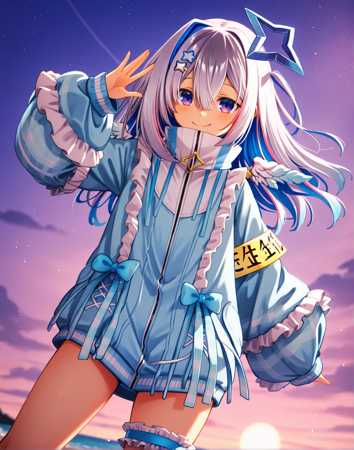 衣装タグ(ジャケットバージョン):オーバーサイズの服、長い髪、濃い青いハロ、長袖、髪飾り、フリル、ミニ翼、ふわふわ袖、ブライダルガーター、青いジャケット、ジッパー、(白い靴下、白い靴、ルーズな靴下:1)、青いリボン