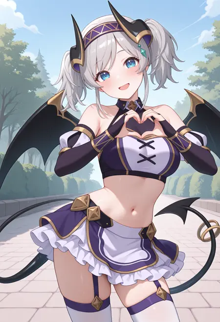 - pakrd3s, 黒い角, 紫のヘアバンド, 悪魔の角, ハルターネック, 紫のアスコット, 交差リボン服, 胸元露出, ツートーンクロップトップ, 黒のクロップトップ, 紫のクロップトップ, 別れ袖, パフスリーブ, ブライダルグローブ, 腹部露出, ツートーンシャツ, フリルスカート, ガーターストラップ, 白いタイツ, 悪魔の尾, 尾輪, 悪魔の翼, 太ももブーツ,