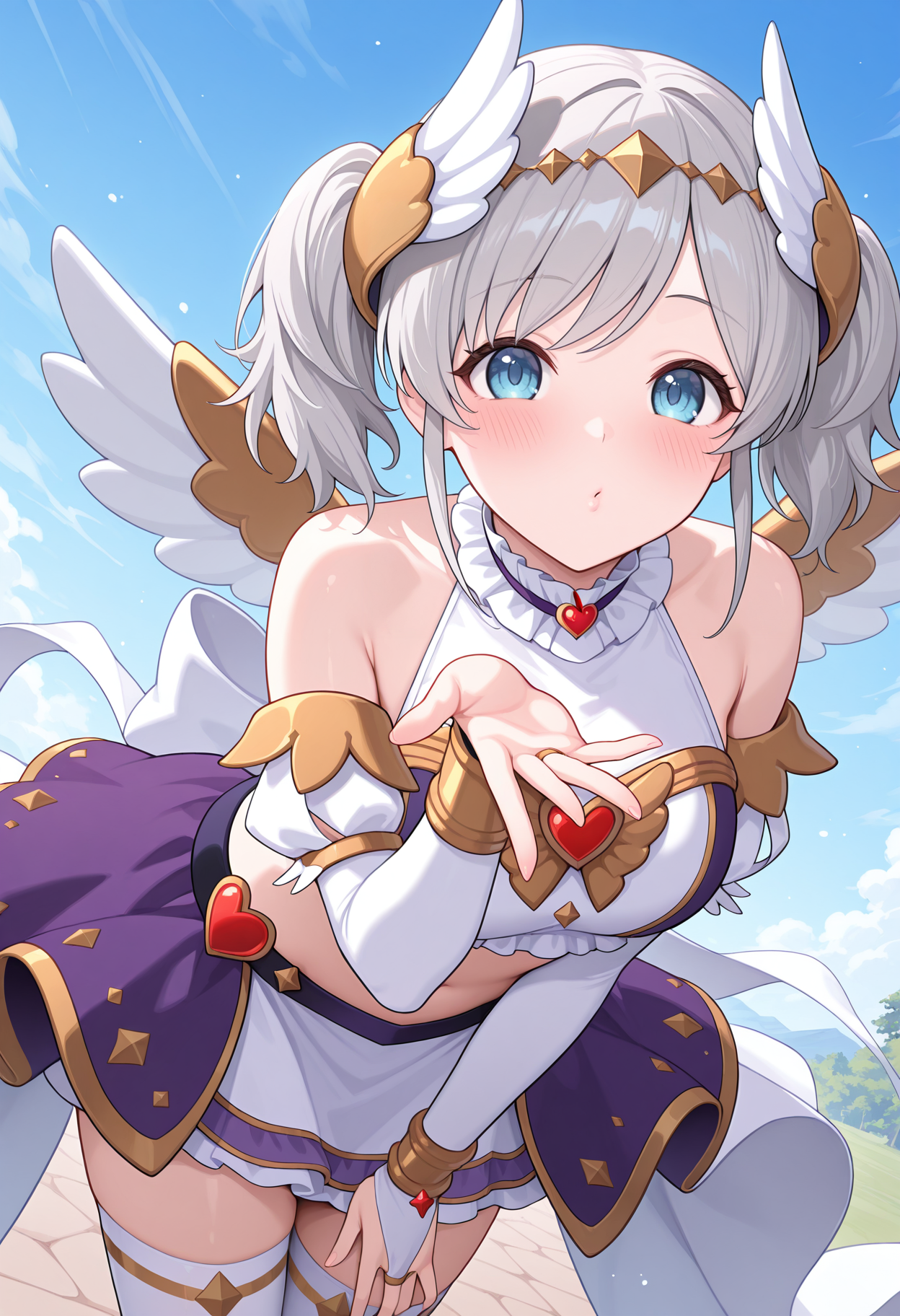 - pakrangl, 翼型ヘアアレンジ, ティアラ, ハルターネック, フリルカラー, ツートーンクロップトップ, ハートブローチ, 翼ブローチ, ゴールドトリム, 白いシャツ, 袖なし, 肩を露出, 別れ袖, 白い袖, ブライダルグローブ, 腹部露出, オーバースカート, 背中リボン, 紫のスカート, 白のスカート, フリル, 白いタイツ, 天使の翼, 白い翼, 紫の靴,