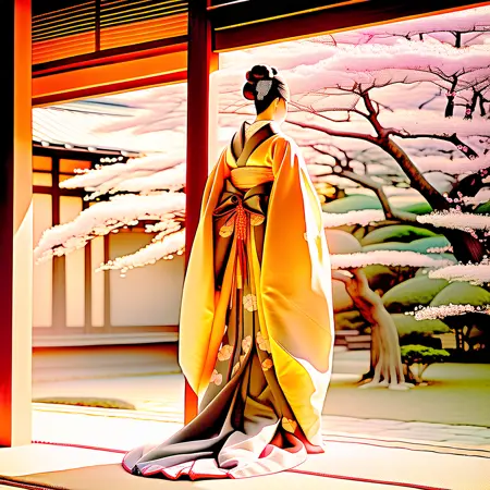 muromachi86, 14th century japan, court noblewoman in layered silk robes, standing under plum blossoms, gentle breeze, open veranda, soft lighting, contemplative mood