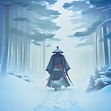muromachi86, 14th century japan, lone samurai walking through falling snow, dล-maru armor partially covered by travel cloak, pine trees and mist in background, quiet expression, soft winter light