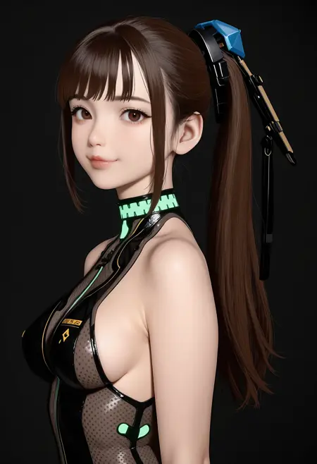 3vilf, 1girl, 棕色头发, 马尾辫, 棕色眼睛, 刘海, 连体衣, 发饰