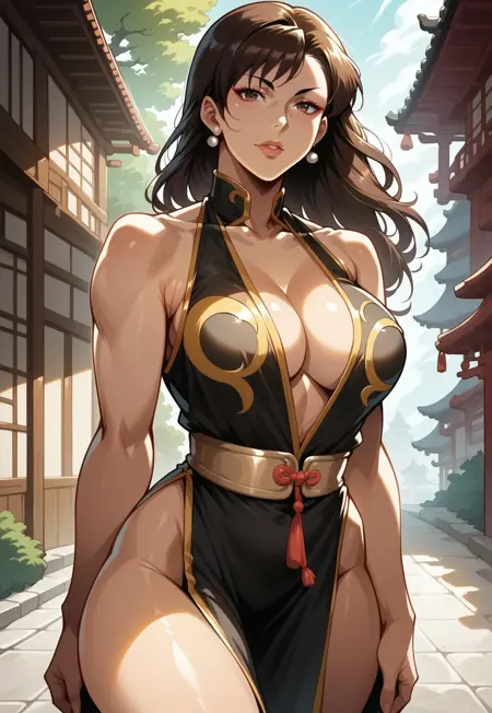 외모 키워드: 갈색 머리, 중간 크기의 티어 드롭형 가슴, 긴 머리/더블 둥글게 묶음, 노란 리본