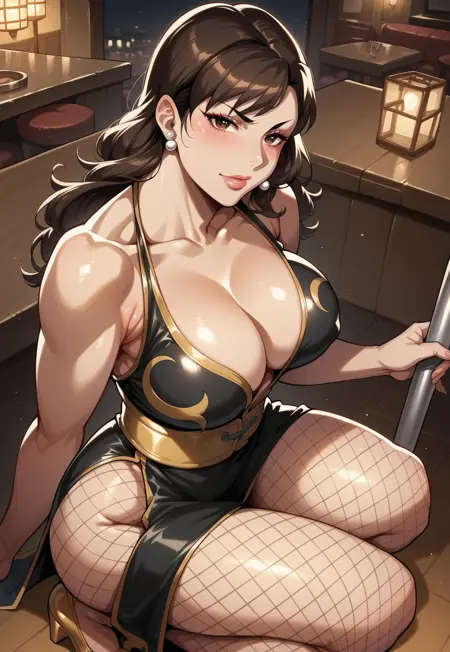 복장 키워드: 검은 드레스, 골반 커튼, / 파란 레오타드, 팬티후스